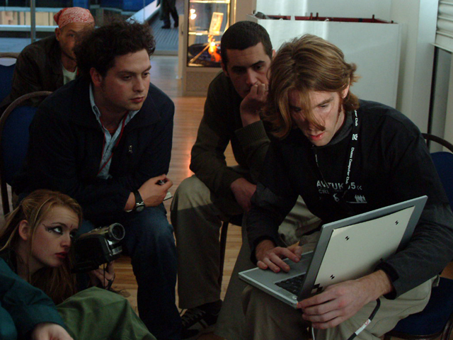 The third talk after this was about NOW! the Movie from Dennise (sp?) manager of the cold cut originated project. She talked about the idea behind the movie and the form of contribution and showed us the pretty trailer. So I have had personal reservations not about the project but about the handling of the project - which seemed to closed and not communicated right - after hearing her talk and show her own contribution to the project I think I will be sending in some of my "world" loops. After that there was the VPEEK with much too loud music and nice but contentless visuals going on in the medicine bar and our table was filling with the "philosophical" crowd that has formed during the first two days - peter rubin, the vidvox crew, michael parenti, brendan byrne, willow and many more. If the music would have been just a little bit quieter a vivid discussion could have aroused - so we had this very intense one to one talks going on until the bar closed and thrown us out (yes to be thrown out is something you have to get used here :/