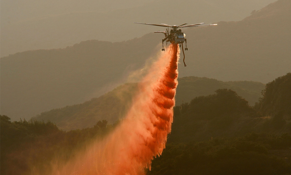 While impressive looking the fire departments are dumping more chemicals into california wildfires every day. The Phos-Check fire retardant is surely making the company who produces them very rich. They claim "its nothing other then a fertilizer" and on surface it looks like it: