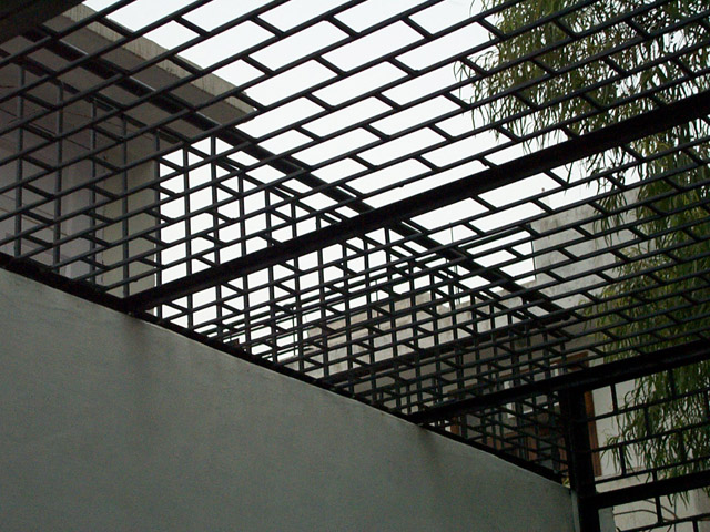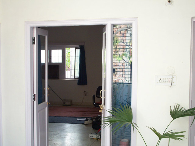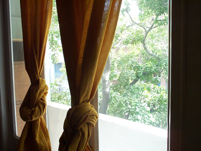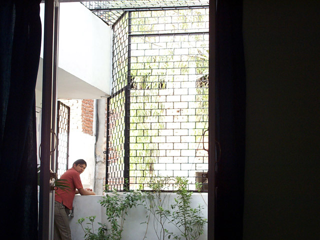 ich lebe im dritten stock, wenn man durch die tür kommt steht ma erstmal auf einer komplett vergitterten terasse, die küche meinen raum und das büro verbindet, aber eigentlich ist alles voller türen die alles irgend wie mit allem verbinden, man kann immer zwischen mindestens zwei möglichkeiten wählen um in einen raum zu gelangen außer beim bad.