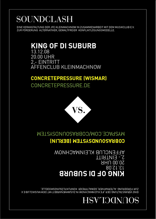 An der Vorbereitung und Durchführung sind die Jungs von Snobb Sound (Gewinner des Vorjahres und inzwischen Residents im Affen) maßgeblich mitbeteiligt und dafür bin ich Byxe und Bastai sehr dankbar. Weiterhin würde die Sache nicht ohne die finanzielle und logistische Hilfe der JFE Kleinmacnow und natürlich des Affenclubs stattfinden. Kosta hat uns wieder mal ein Augenschmauss von einem Flyer gebaut, welcher die Tage auf dickem Papier unter die Leute kommt.